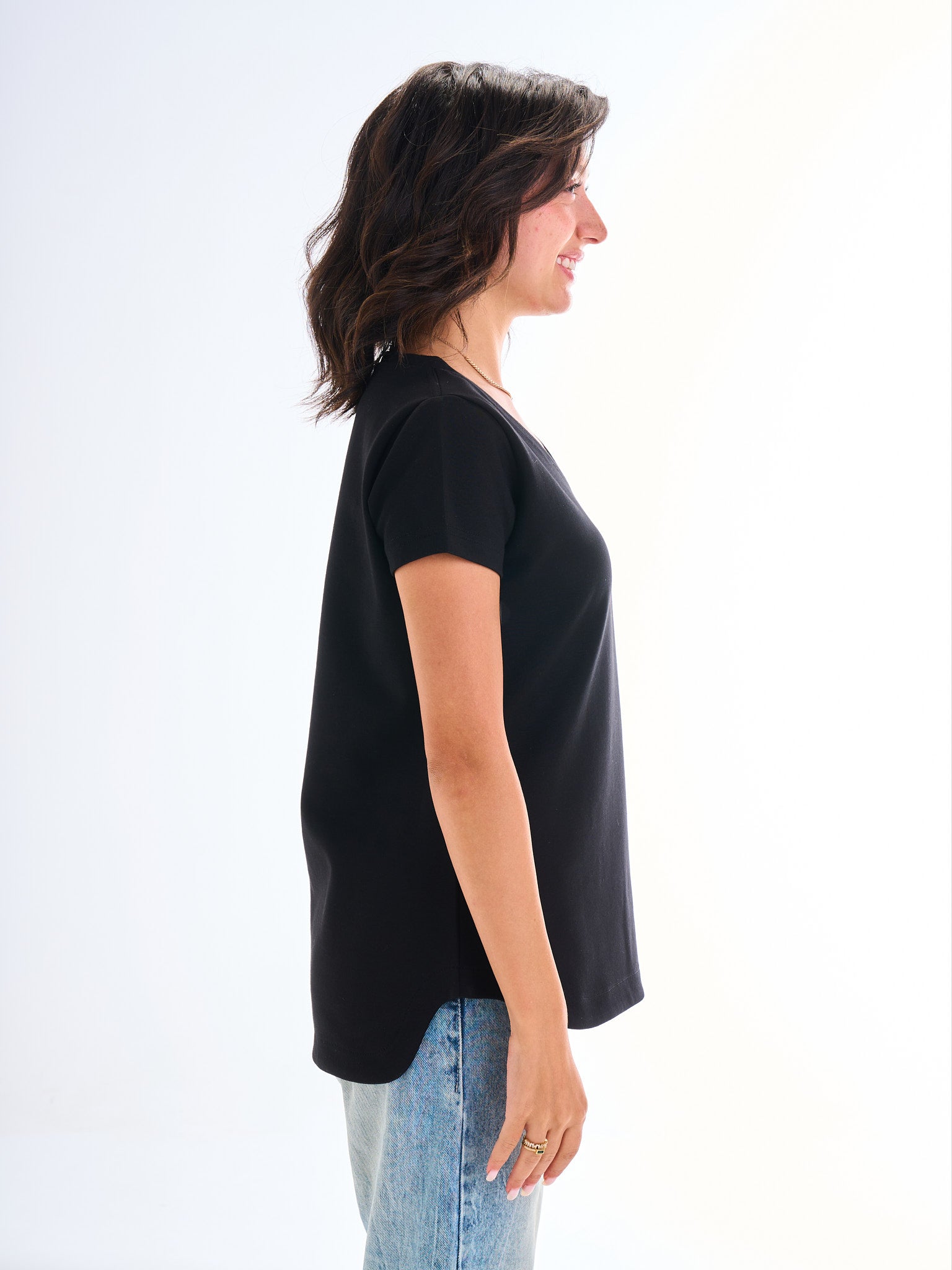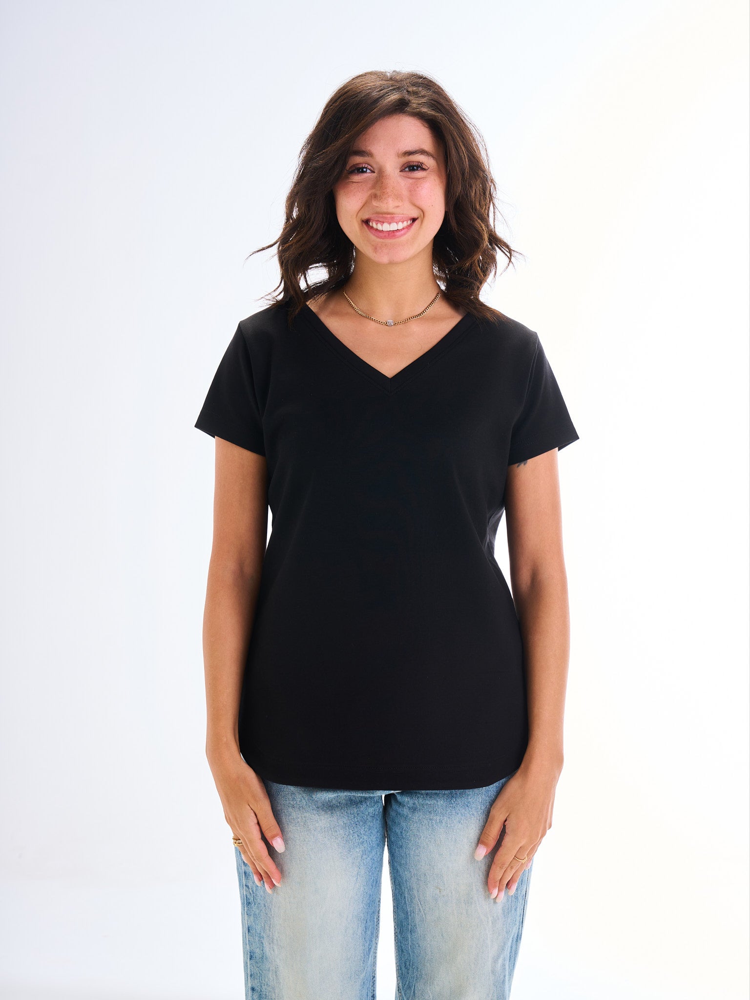 This regular-fit tee is cut with a flattering V-neckline and a relaxed hip for everyday ease. Made from dense, non-see-through cotton, it balances comfort and structure for both casual looks and layered outfits.