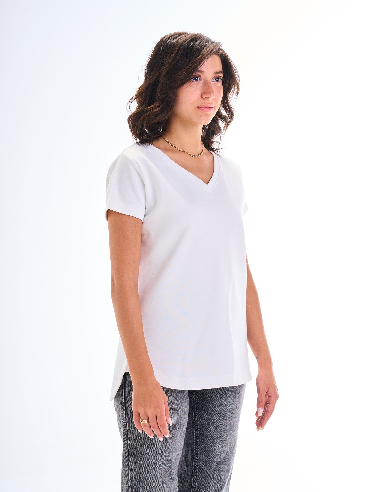 This regular-fit tee is cut with a flattering V-neckline and a relaxed hip for everyday ease. Made from dense, non-see-through cotton, it balances comfort and structure for both casual looks and layered outfits.